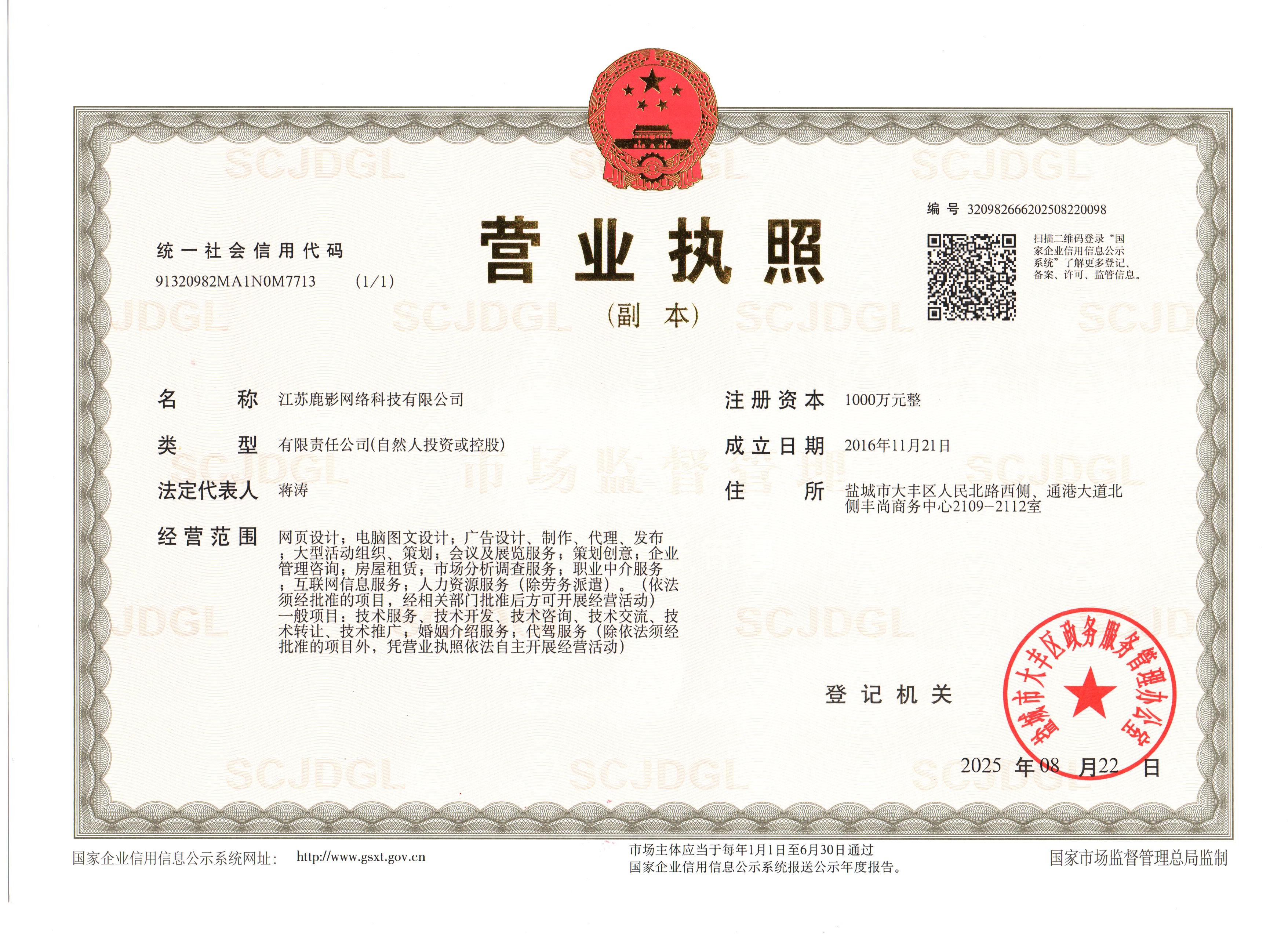 Copyright @ 2020 江苏鹿影网络科技有限公司通讯地址:盐城市大丰区人民北路西侧、通港大道北侧丰尚商务中心2109-2112室